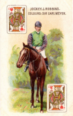 Cigarette playing card, 1914, showing the celebrated jockey Herbert Robbins (1887-1927) wearing Carl Meyer’s racing colours. Part of ‘Jockeys and Owners’ Colours with Playing Cards inset’, published by Wills as a Scissors Set.