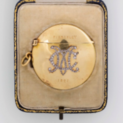 Sorting through my parents’ effects after my mother’s death in January 2006, I found a small gold vesta personalized with a cypher formed of the letters CM inset with diamonds beneath the inscription ‘KIMBERLEY’ and above the date ‘1907’. On the reverse is the cypher LR enamelled in blue and yellow beneath the inscription ‘SHORTGROVE’. This was preserved in its original leather box with the name of the retailer ‘Catchpole and Williams, Oxford Street’, printed on the upper silk lining.